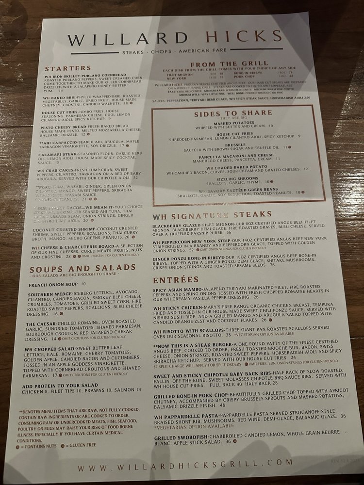 Welcome to Willard Hicks Morgan Hill, an exquisite dining destination that merges contemporary New American cuisine with a classic steakhouse experience. Nestled at 17270 Monterey Rd, this establishment shines with its top-notch menu featuring a selection of certified Angus beef steaks, including the tantalizing Blackberry Glazed Filet Mignon and the robust Bone-in Ribeye. Each dish is carefully crafted, ensuring a burst of flavor in every bite.